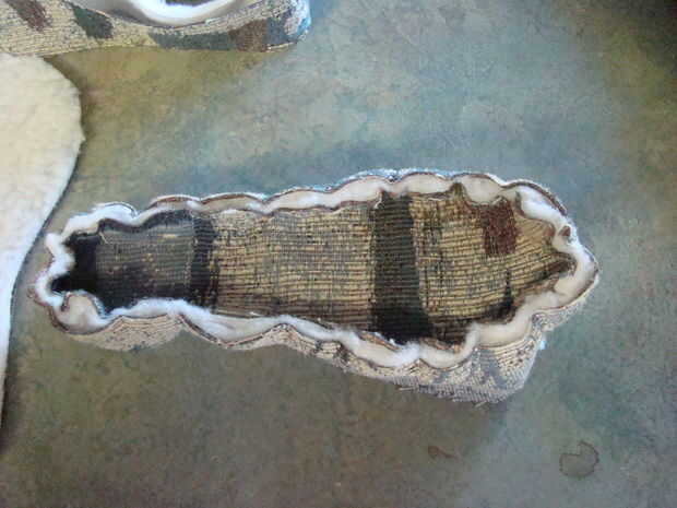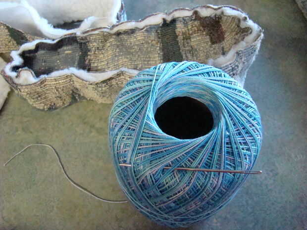 Pin a una de las piezas de lado a una de las plantas.  Cubrió el borde recto de la parte para los bordes de la suela.  Había enhebrada la aguja de coser de mano con un trozo largo de hilo de crochet.
