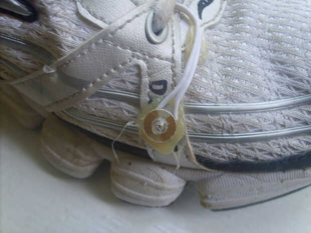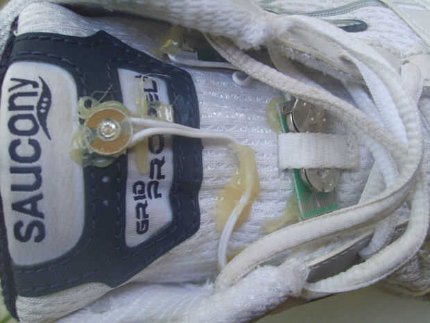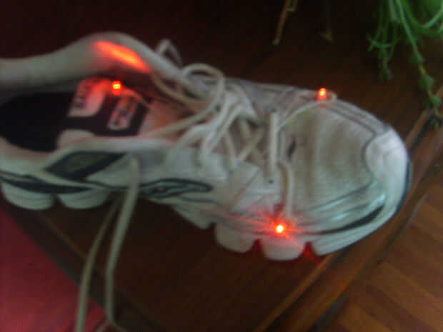 sólo en caso de que se ejecuta en el tono negro como hago la mayor parte del tiempo, encontré y el viejo par de zapatillas de luz hasta de mi hijo en la basura (que son los modelos de Buzz Lightyear de cualquier Walmart o Target) y arrancó el sistema de iluminación LED de ellos y caliente-pegado a mis zapatos para correr, ahora , con cada paso en la noche, hacen un espectáculo de luces crazy para el tráfico que se aproxima.