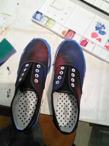 Sumerja la esponja en uno de los colores y aplique una capa delgada de pintura en el zapato. No poner demasiada pintura en la esponja y asegúrese de que se separan completamente la pintura en el zapato. La pintura no debe formar una capa en el zapato, deben "mezclan" con el zapato (ver imagen). De lo contrario la pintura se agrietará cuando caminas.