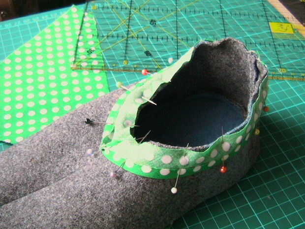 Pin el borde desplegado del enlace hacia el exterior de la zapatilla. Coser alrededor con un margen de 5mm. Recortar el margen de costura.