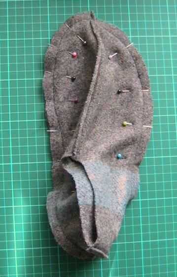 pin la parte superior de la zapatilla a los lados mal único deslizador junto (así el interior del paño grueso y suave será en el exterior), con un margen de 1cm. Recortar el margen de costura.
