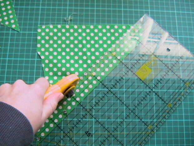 De tu retal de tela colorida corte unas tiras en diagonal. Mina son 3cm de ancho, pero usted puede hacer más si quieres.