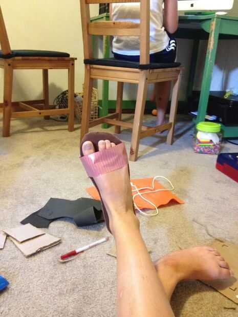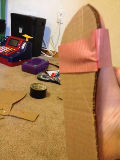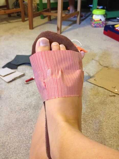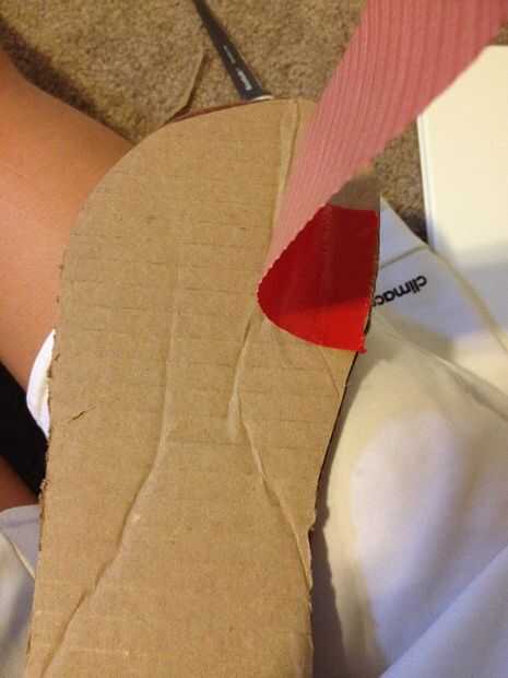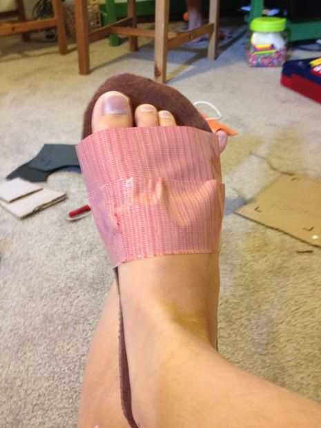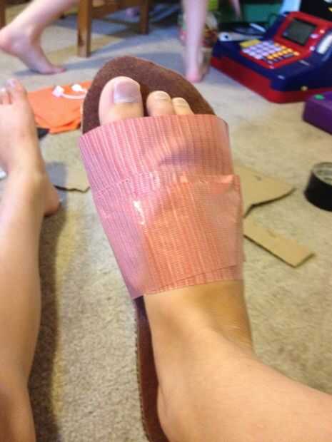 Tomar la cinta del conducto y en la parte de cartón del zapato, colocar aproximadamente una pulgada de cinta en la cartulina. Entonces, "flip" y, fijar el pie sobre el fieltro. Envuelva el conducto cinta alrededor de su pie como visto en las fotos. DEBE ser el lado pegajoso hacia arriba!!!!!! Hacer esto un par de veces, por lo que está cubriendo todo por encima de su tobillo excepto los dedos del pie.