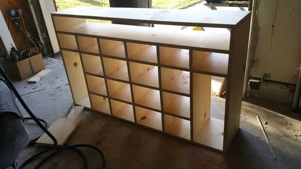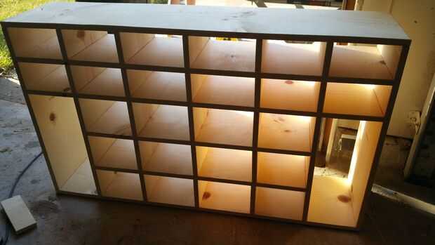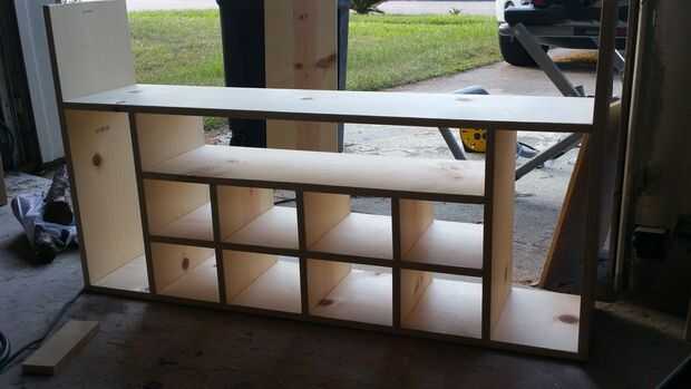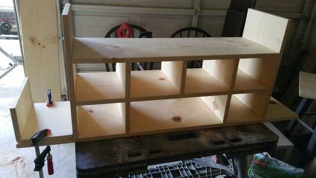 Las paredes exteriores serán dentro de la Junta de 49 1/4" y tendrán que ser considerado en la siguiente parte. En el tablero de 49 1/4"(1" x 12 "x 49 1/4") Coloque un trozo de madera al ras del borde. Utilice al separador de 7" y sujete al ras a lo largo del trozo de madera. (Imagen 5) Aplique pegamento en el borde inferior de los cubbies y fije con clavos. Con el espaciador de 8", agregue la pared de centro. (Imagen 6)