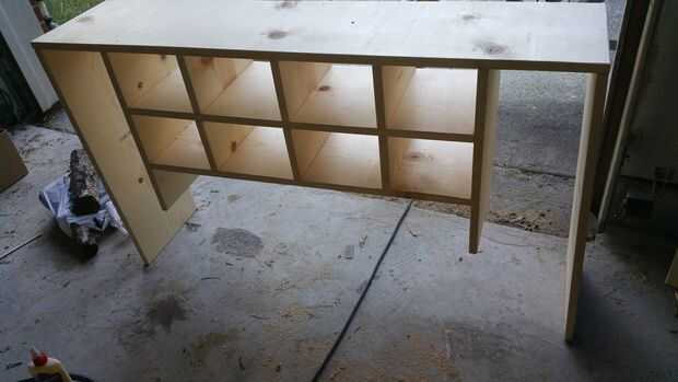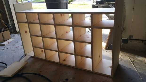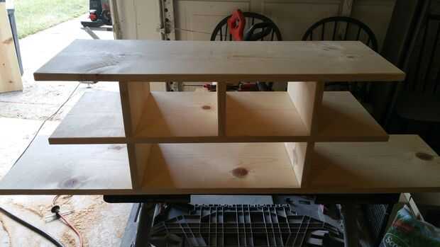 Usando 4" paredes como guías, alinee 2 47 3/4" Junta. Agregar el pegamento y fije con clavos. Una vez en su lugar, comience en los exteriores y las paredes de lugar dos 2 con espaciadores de 7". Usando al espaciador de 8", coloque la pared de centro. (Imagen 10)