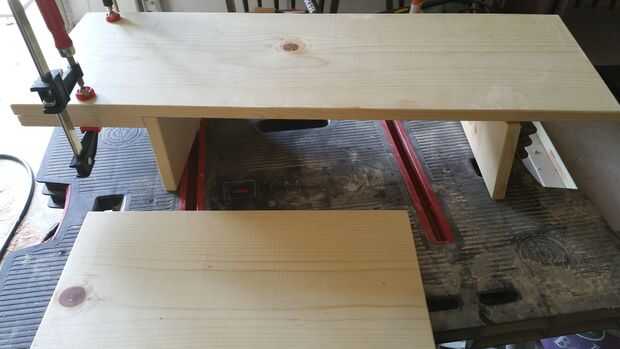 A partir de un tablero de 32 1/4"(1" x 12 "x 32 1/4") Coloque el espaciador 7" al ras con el lado corto (12 pulgadas). (Cuadro 1) El espaciador a la Junta de la abrazadera y tapa. Usando al espaciador como guía, coloque una tabla de 5 1/2" flushed verticalmente contra él. Añadir pegamento para madera a lo largo del borde y fíjelo con clavos. (Foto 2) Repita este paso en el extremo opuesto (horizontal) de la Junta de 32 1/4". Felicidades, tienes un banco miniatura. Crear dos de estos "bancos".