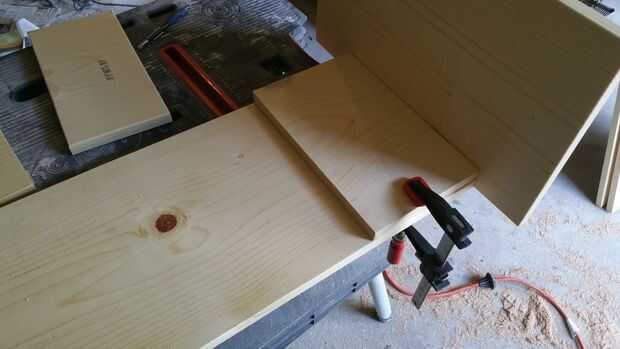 Apilar los bancos uno encima del otro y alinear. Agregue pegamento de madera en el fondo del Banco superior y fijar en el banco inferior con broches. (Imagen 3) Con el espaciador de 8" y la técnica de arriba, agregue la pared de centro. Agregue pegamento para madera a lo largo de los bordes y sujetar con clavos. Se trata de un ajuste apretado, y es más fácil si se empieza en un ángulo. (Imagen 4)
