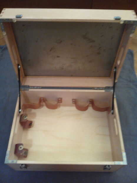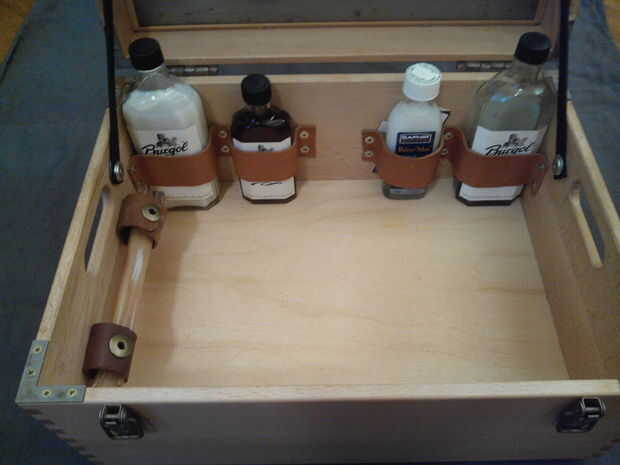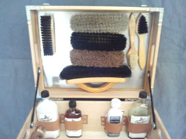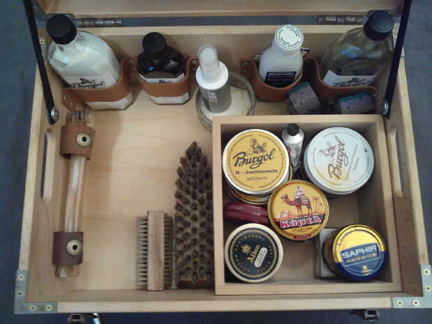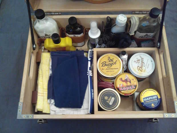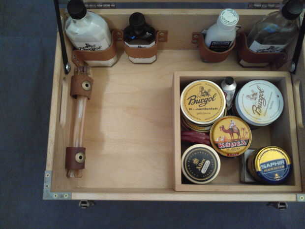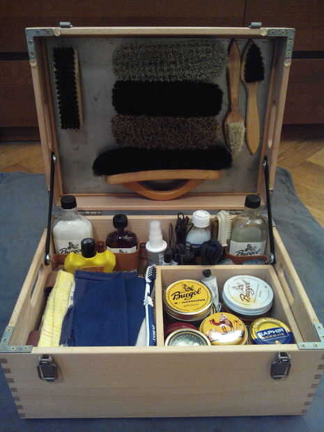 La caja de zapato brillo está lista para llenarse de cremas, ceras, aceites, cepillos, huesos;-), cordones y así sucesivamente. La caja tiene ahora el tamaño 30 x 40 x 21 cm.