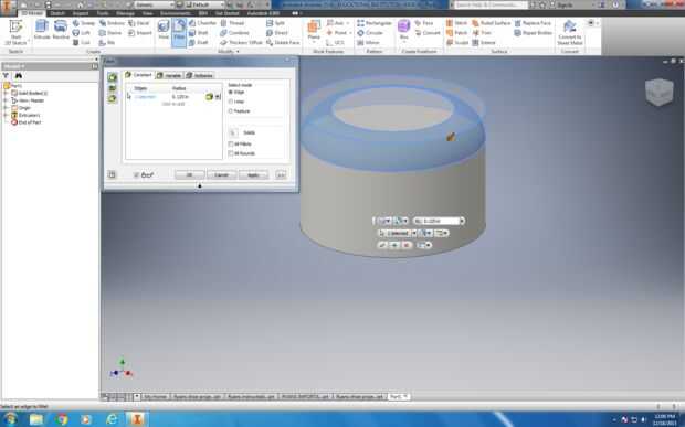 Hay un total de 4 parte que este invento funcione. La primera parte es la más fácil. Crear un círculo ancho de diámetro 0,75 pulgadas. Saca el círculo de 0,25 pulgadas. Después de esto tienes que encontrar la herramienta de filete en la barra de herramientas superior y selecciona el anillo superior de cilindro de ahora. Hacer el filete de 0,125 pulgadas.