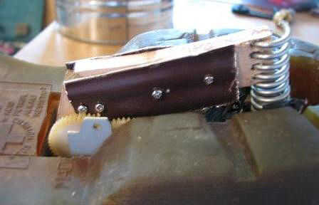 Ahora conectan la palanca que es la parte que realmente bajar en. Perforar una serie de orificios en un lado de una pieza delgada de madera, luego enroscarse en la primavera. Entonces lo conecté a la madera del árbol con unas tiras de tubo del canal y algunos tornillos. No parece demasiado lujo, pero es realmente bastante robusto.
