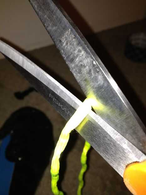 Cortar un pequeño triángulo de la parte superior, luego corte los orificios en el lado. También cortar el paracord a medida.