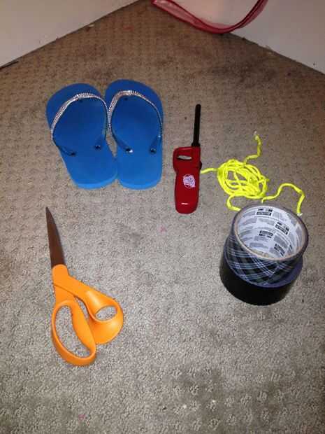 Se necesita:-viejas ojotas - cinta de conducto - algún tipo de cuerda (yo usé paracord) - tijeras - más ligero (opcional. Yo no soy responsable por los daños que causa a su auto)