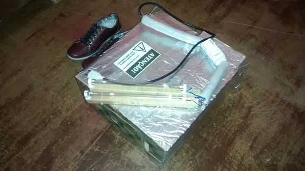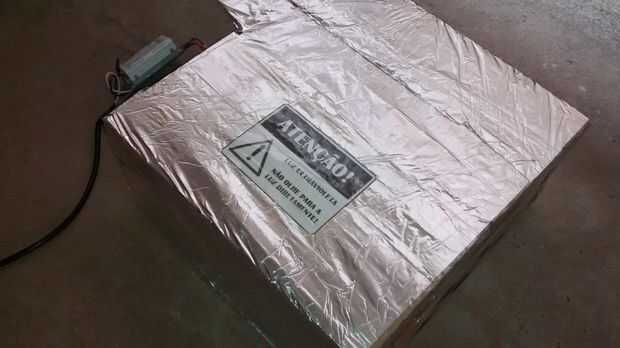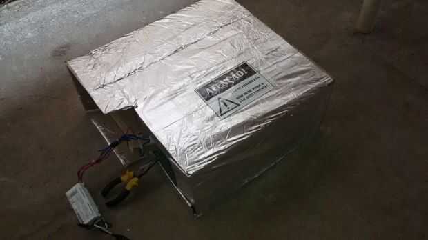 Ya que mucha luz puede escapar a través de las paredes del recipiente de cartón, he decidido envolver en papel de aluminio, que tiene un 88% de reflectancia en el rango de UV que estamos trabajando en el. También, he decidido añadir una muestra de la precaución (obviamente en mi idioma) para evitar que alguien que pueda pasar alrededor desaconsejada.