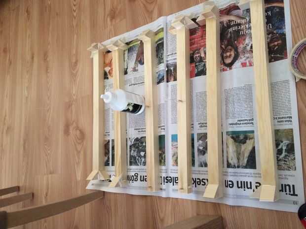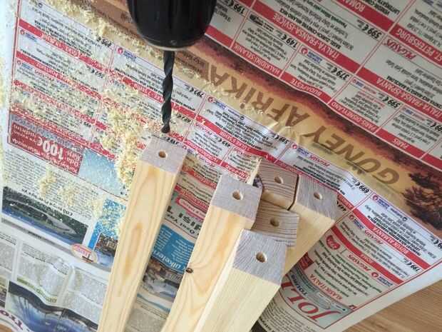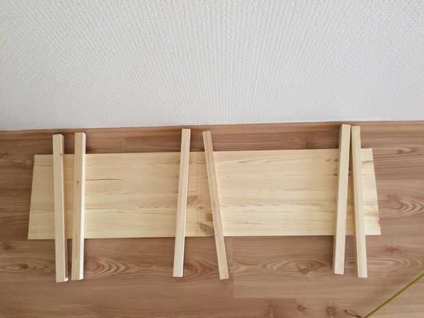 las articulaciones entre la pierna y la placa superior es pernos de madera. orificios de 1cm de altura en las patas y la placa superior será suficientes para los pernos. pegue unos perfiles de madera triángulo al final de las piernas. Este triángulos será soporte para la estructura y estantes.
