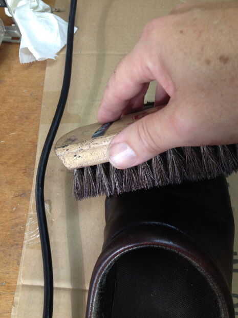 Este es el proceso normal.  Aplique el esmalte bien y masaje en el cuero.  Dejar 5 minutos seco y buff con un arbusto de zapato.  Ahora usted tiene solamente una capa muy delgada de izquierda polaco en el zapato.