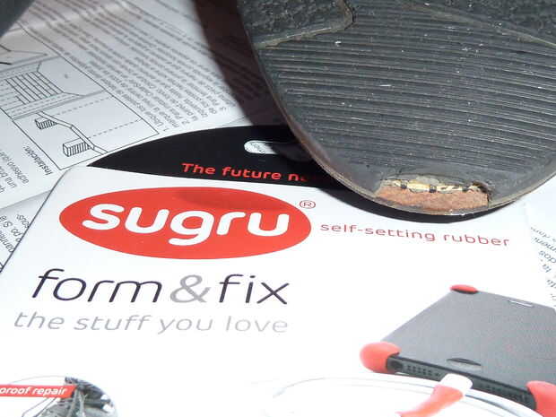 De alguna manera, en algún lugar, mi favorito par de zapatos de vestir capaces de perder la punta de la suela de la zapatilla derecha. Como yo necesito zapatos de vestir de vez en cuando, conciertos, entrevistas, actuaciones, realmente deberia ser reparadas. Podría enviar al fabricante para ser resoled para $95 o una remodelación completa en $140, pero ¿por que cuando tengo un paquete de Sugru negro a mi mando?