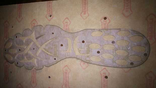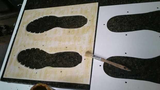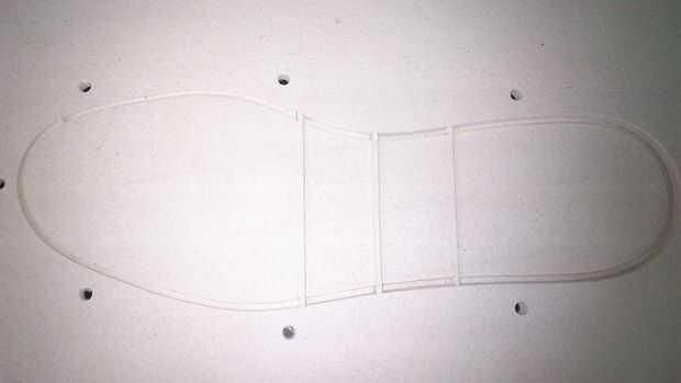 La capa superior y el diseño de la parte inferior de la planta del pie fueron los más difíciles de pegar. Poner pegamento en todas las piezas que quiere salir pero dejar los alrededores para que se puede tirar una vez el pegamento esté seco. Mi diseño tenía algunas piezas bastante pequeñas que tuvieron que ser reparado y una vez reemplazado con arcilla como se aprecia en la foto. Todo el diseño se puede hacer así en arcilla si quieres.