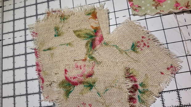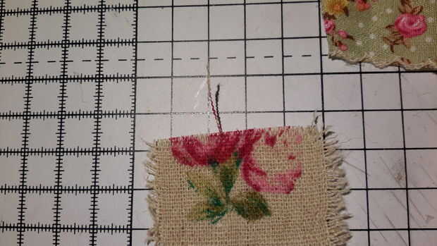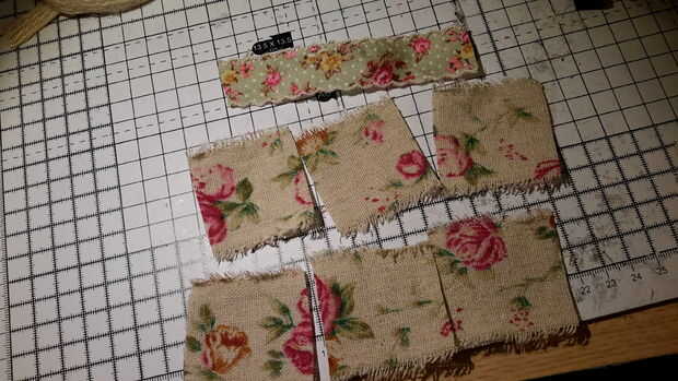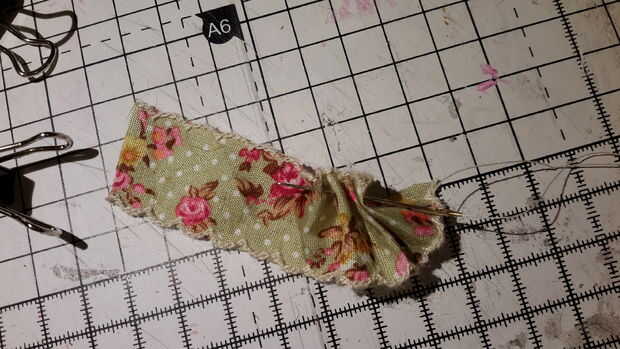 No hay ningún arte exacto para esto. He utilizado cuadros de una cinta y una tira larga fina de otro. Luego había deshilachado del borde de la cinta más grande y cosido libremente a un lado de la cinta más delgada a manojo en un semicírculo.