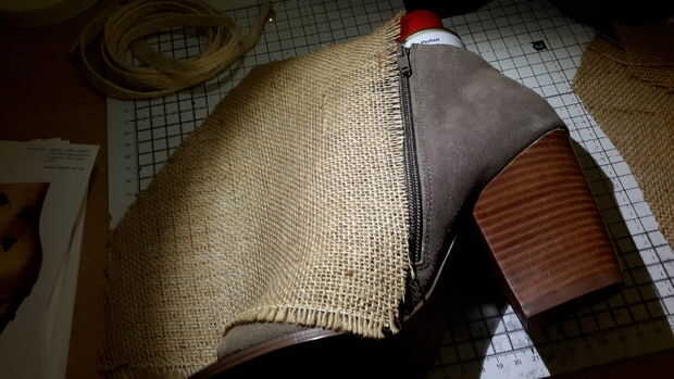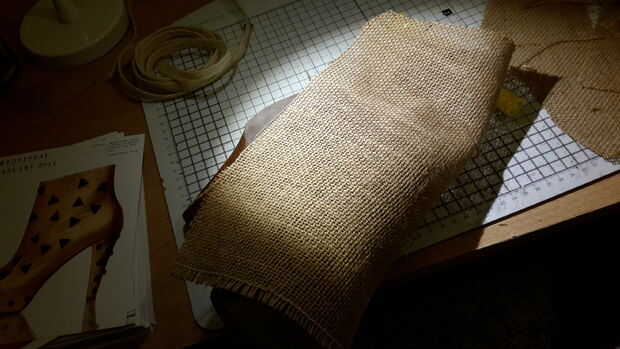 Rellene su zapato con lo que tengas a mano simular un pie. Entonces ponen la arpillera sobre el zapato y cortar aproximadamente la forma que necesita hacia fuera.