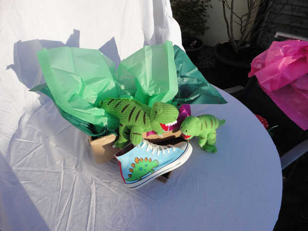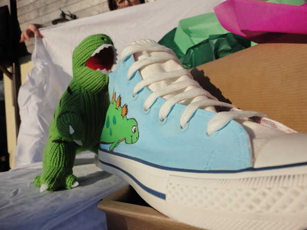 Pinta el dinosaurio primero, luego cubre el resto del zapato en azul. Tuve un poco de ayuda de la internet sobre cómo hacer mi dino tan lindo como un botón!