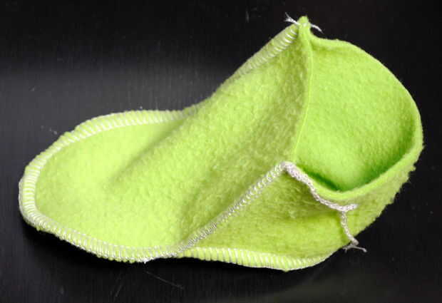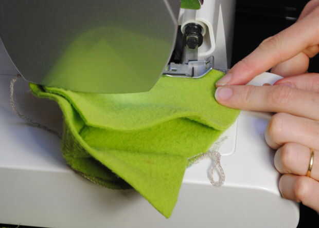 Sarga o coser alrededor del borde, otra vez asegurándose de no estirar cada trozo de lana demasiado en relación con el otro. Generalmente me resulta más fácil colocar la pieza plana (arriba) en la parte inferior las uniones ya cosida en la parte superior y puedo estar seguro de maniobrar en su lugar correctamente. Por supuesto, estas fotos fueron tomadas en la otra orientación - trabajan de ambos.