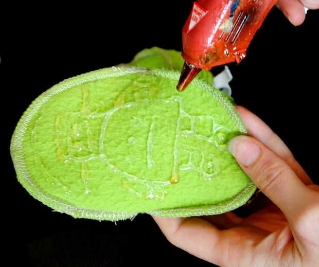 Utilice una pintura de tela o pistola de pegamento caliente para agregar líneas, puntos o el divertido diseño de su elección a la parte inferior de la zapata. Asegúrese de que se enfríe y se seque antes de permitir su kiddo en cualquier lugar cerca de los zapatos.
