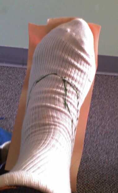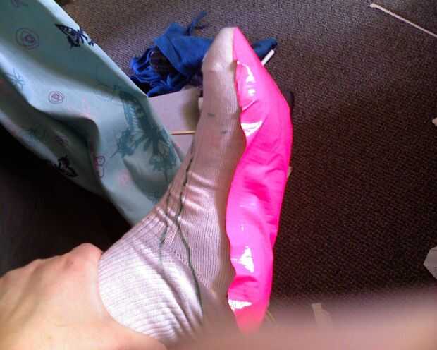 Objetivo: Cool, ahora vamos a envolver los calcetines en la cinta. Empezaremos por poner en la suela. Esta manera, estamos garantizamos un montón de cubierta en la parte inferior de los pies.