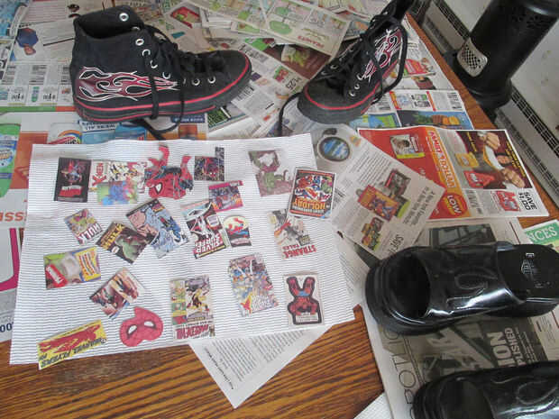 Compré a una guía de precios de maravilla en una tienda del libro usado porque tenía algunas páginas de brillantes impresionantes en el centro lleno de mini cuadros, perfecto para el arte del tamaño del zapato. Mi hija utiliza el funnies del periódico del domingo de su Nana.