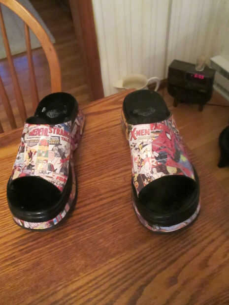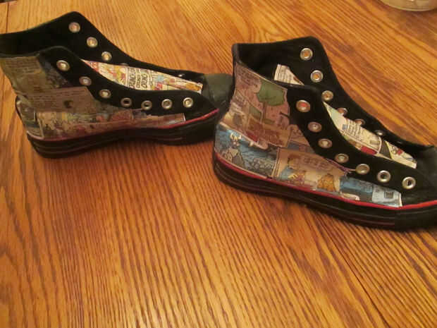 Pensé que estas sandalias necesitan un poco de color más así que encontré un libro de historietas y salió mi pegamento decoupage!Paso 1: fuentes de Para hacerlos necesitarás:Par de zapatos con plataformas de corchoPegamento mod PodgeComic bookTijeras