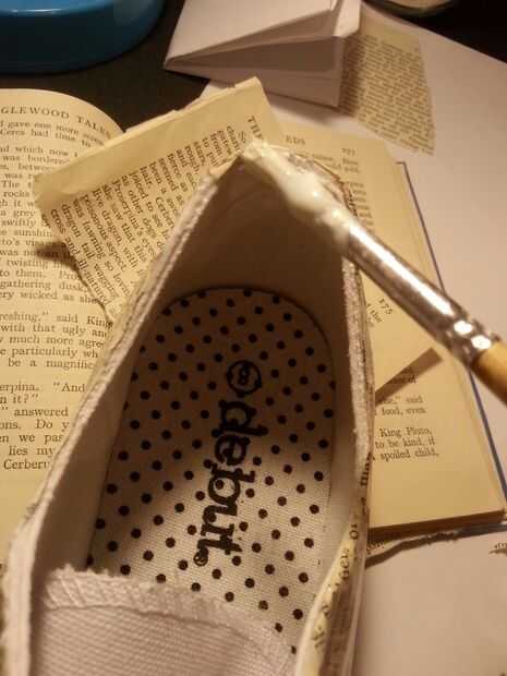 Una vez que los lados del zapato están cubiertos totalmente en el papel, es hora de sellarla. Utilice el mismo pegamento como antes y pincel pegamento en una capa delgada sobre los lados. Espere 20 minutos para que el pegamento se seque antes de cepillado en otra capa. Esto sellará el papel y alise los lados, lo que es más durable por lo que durará más. Si desea un acabado brillante o protección adicional, añadir unas cuantas más capas de la cola.