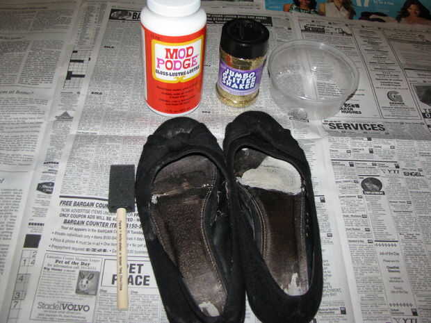 estoy muy contento de presentar mis zapatos modificados para requisitos particulares con brillo! Y ahora, te digo Cómo renovar tu zapatos viejos!Paso 1: , Necesitará: modge podge, purpurina y masking tape.Paso 2: mezclé negro y plata brillo, en un va