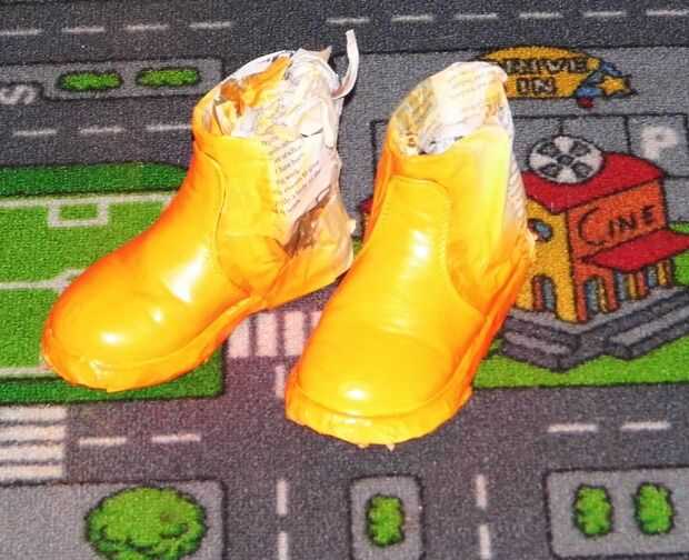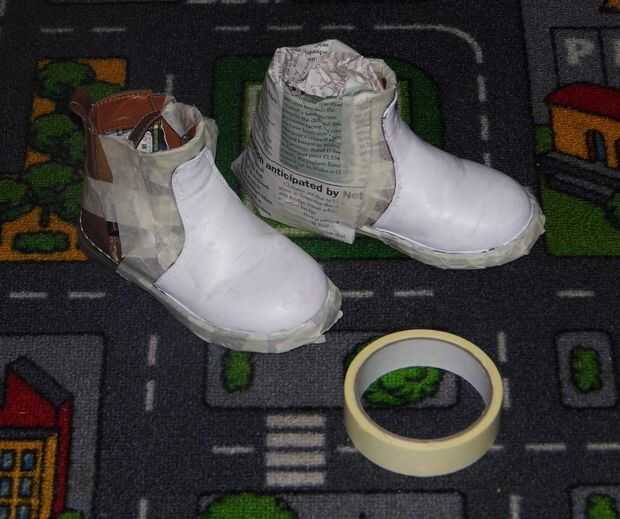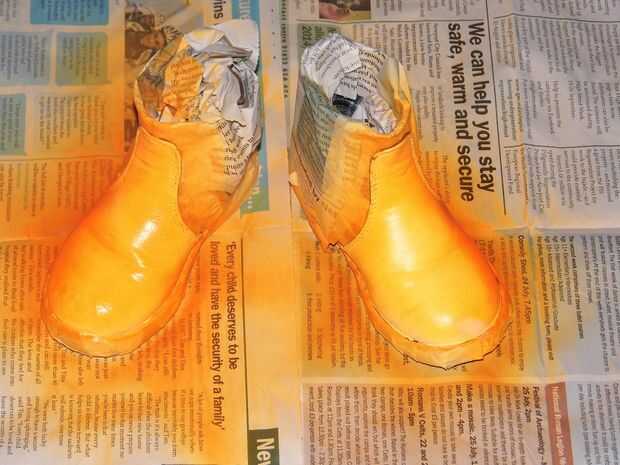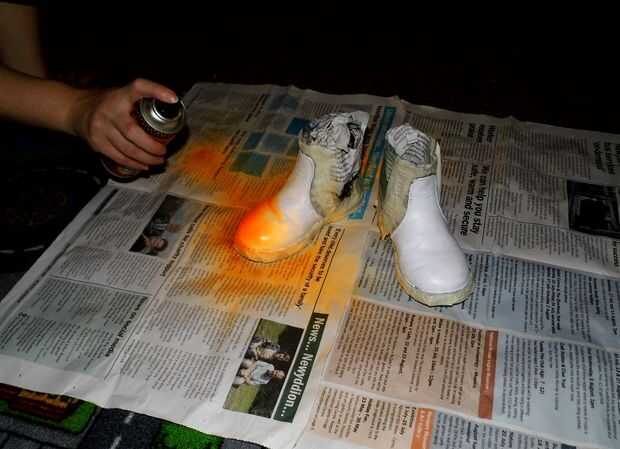 Después de acabado y secado las tres capas de látex, puse una cinta de enmascarar todo los zapatos y había rociado con pintura de acrílico naranja. Rocía 3 capas en total.
