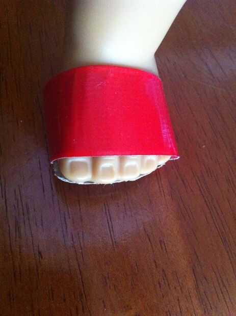 Un final pegamento de la cinta de pato doblado. Luego poner en el pie de muñecas y pegar el otro extremo.