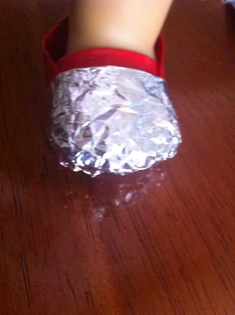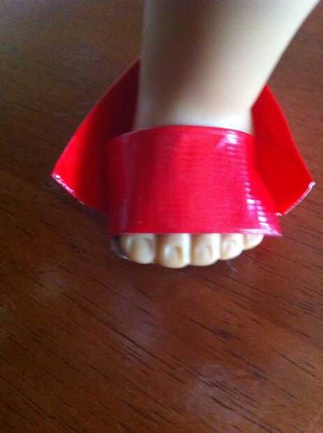 Poner el zapato en el pie de muñecas y envuelva un trozo de papel aluminio en la punta del zapato. Finalmente poner la última pieza de conducto de cinta sobre el papel de aluminio.