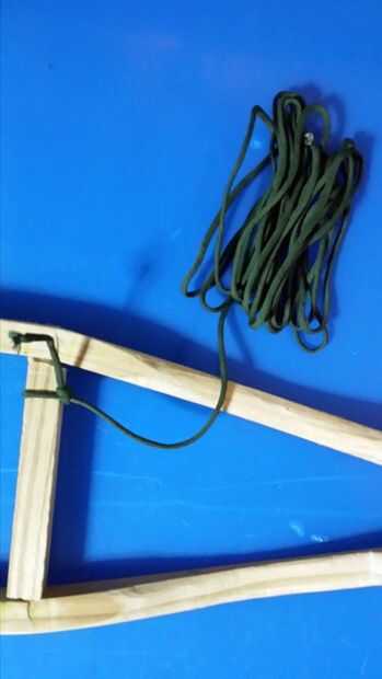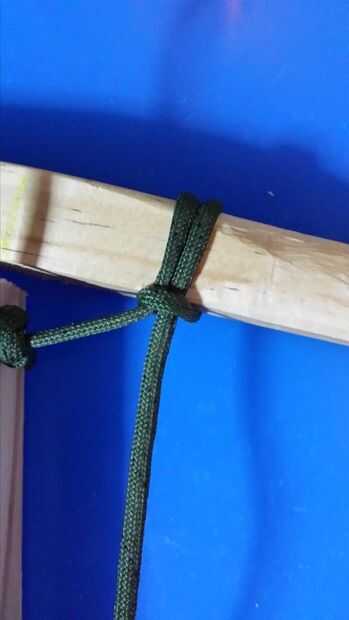 Inicio la punta haga un nudo deslizante en la barra transversal cerca de un lado. Luego ir diagonal a la tabla larga (como se ve en la foto) y el nudo que muestra la segunda imagen que lo llamaremos un nudo de día porque no recuerdo lo que su llamado.