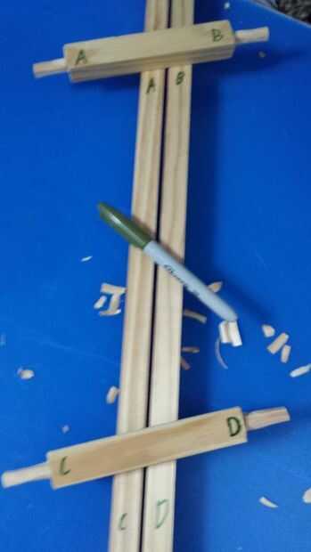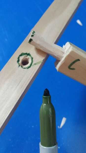 Tomar tu sharpie y marca las letras A B C D en los puntos donde desea sus vigas cruzadas para ir. Luego hacer lo mismo a los extremos correspondientes de sus vigas cruzadas. A continuación traza la espiga de sus vigas transversales en el lado de la junta mayor. Usando una broca del mismo diámetro que el círculo remonta sólo perfore un agujero en el lado de la tabla larga. Si las vigas cruzadas no caben archivo abajo los bordes del agujero hasta que encaja