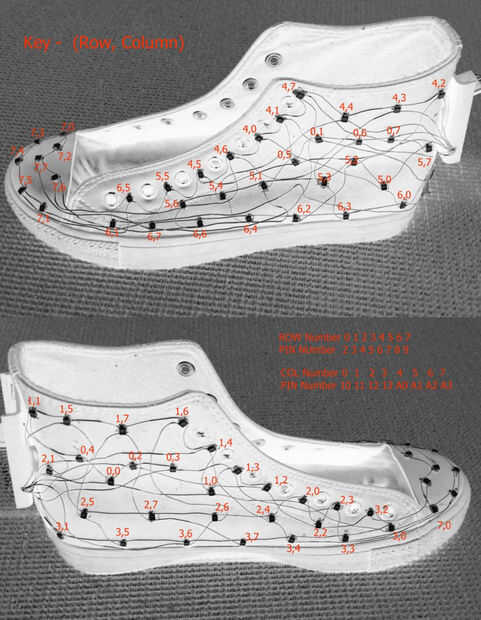 Los LEDs son sorprendentes fácil de conectar. Usando la tabla proporcionada, iniciar en la parte delantera de la zapatilla y mueva hacia atrás. El alambre de cobre tiene aislamiento de barniz en el exterior de la misma para evitar cortocircuitos. Cuando se conecta a los LEDs, se puede ser "estañado" con el calor del soldador, que se quemará con el barniz aislante (ver foto arriba)