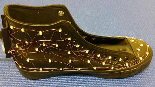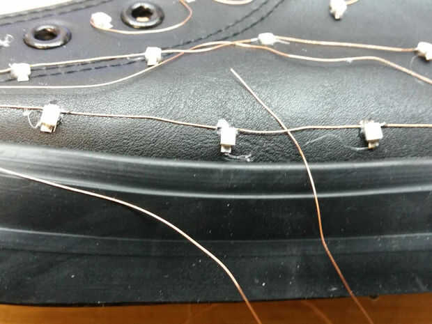 Coloque el alambre de cobre sobre el zapato, poner una torcedura en el alambre en la próxima conexión de LED y usando el soldador, estaño el alambre de cobre antes de soldar en su lugar. (Véase el cuadro arriba)
