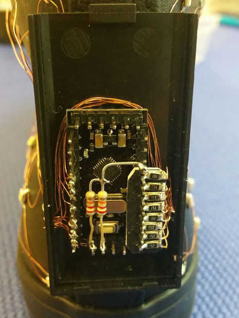Una vez que eres feliz, entonces usar pintura negra para cubrir el alambre de cobre. Espere hasta que seca y luego cubrir toda la superficie (incluyendo los LEDs) con selladora"estanque" para impermeabilizar las conexiones.
