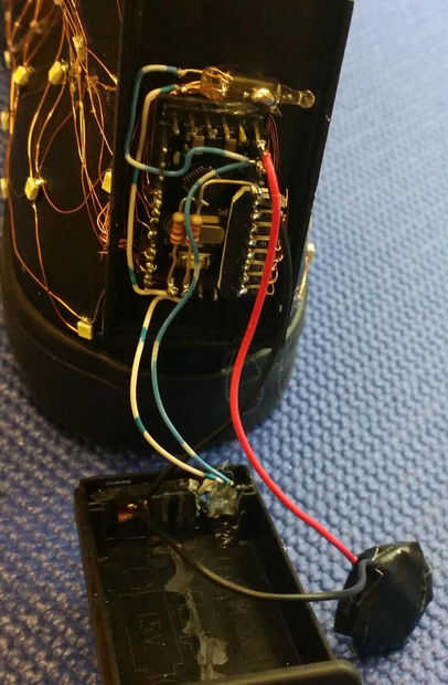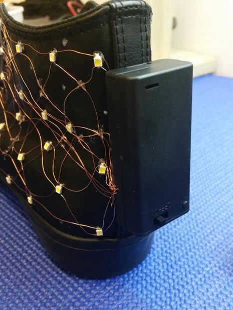 Para cada zapato, usé 2xCR2025 baterías como son fino y ajustado en el caso. Baterías de 3v reciben alimentación de 6v para los 5v de Arduino Mini Pro. Las baterías se celebraron junto con cinta adhesiva y alambre de conexión y utiliza cables de conexión como abajo.
