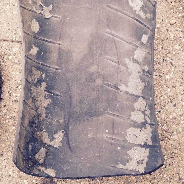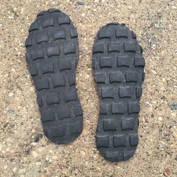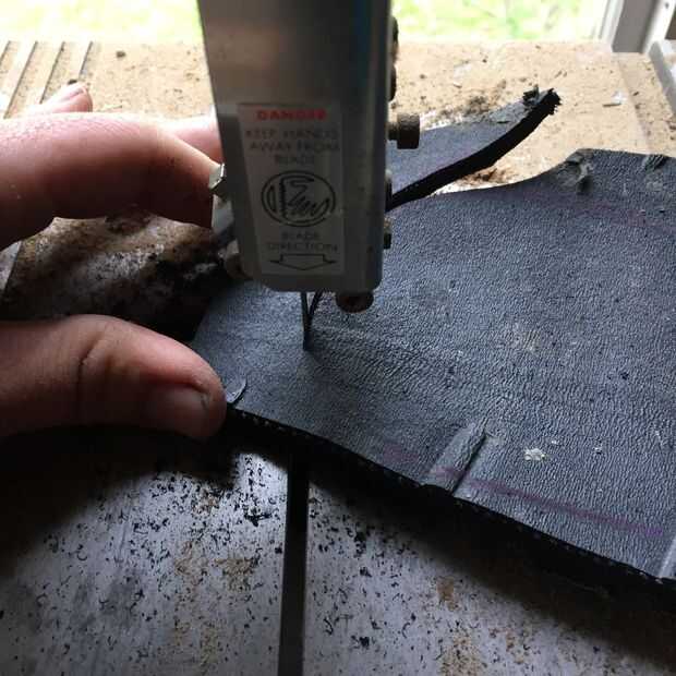 Comience cortando la pared lateral. Lo hice muy fácilmente soldando una hoja de afeitar a y viejo multi herramienta cuchilla. Esto corta la goma como la mantequilla. Corte una sección de longitud ligeramente más largo que el pie. Usé un zapato que me gustaba y trazó la planta del pie en el neumático. Después de que todo lo que tienes que hacer es cortar el patrón con y la Sierra de banda (que es lo que he usado) lijar los bordes y tienes una gran suela de neumático usado busca para sus zapatos.