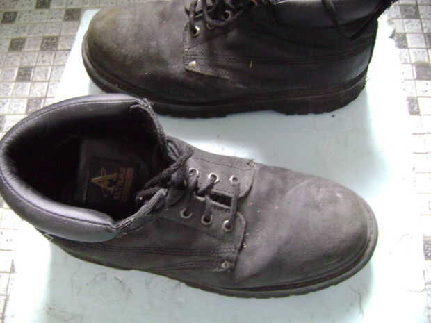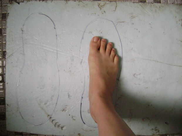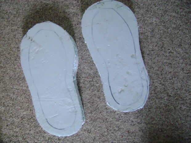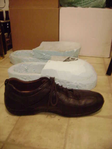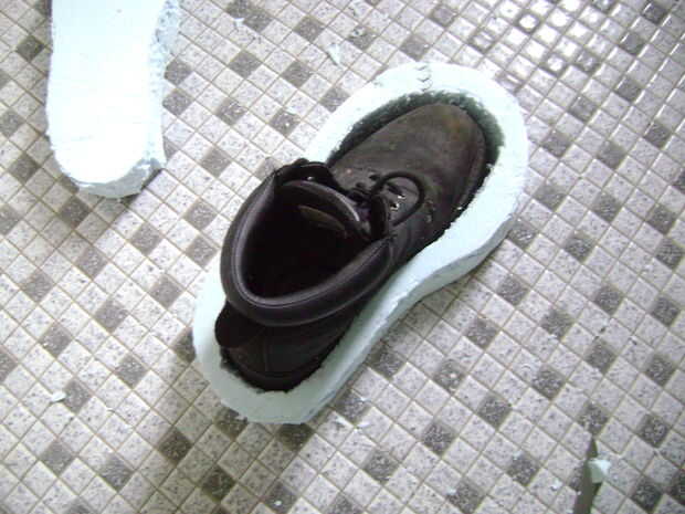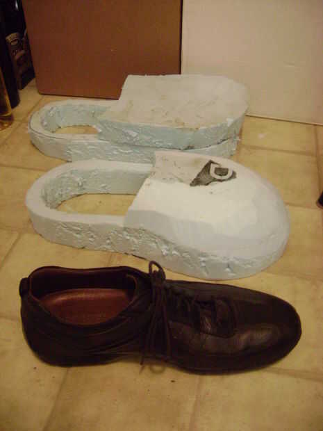 Coge el mayor par de zapatos que usted puede encontrar. En mi caso fue 13 botas de trabajo de mi pareja tamaño. Trazar el contorno de los zapatos o botas en la espuma. Si no tienes los zapatos grandes prácticos, sólo podrían rastrear sus pies.