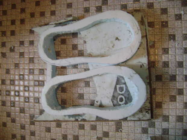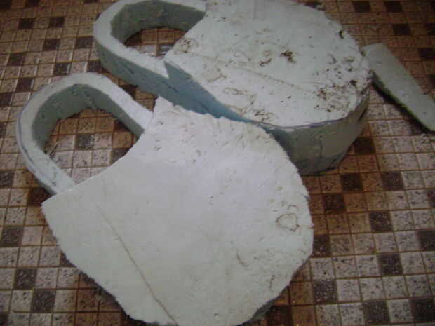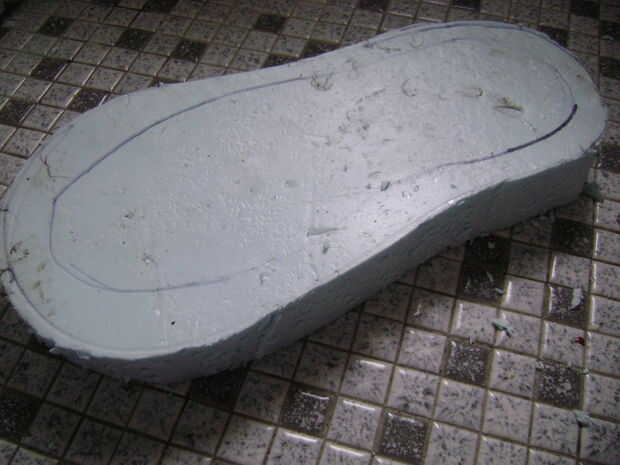 Cuando el pegamento esté seco, utilice un cuchillo para tallar la espuma en la forma correcta. No te preocupes si no es perfectamente liso, ya que pronto se cubrirá la mayor parte de la zapata con papier maché y tela.