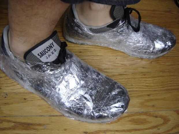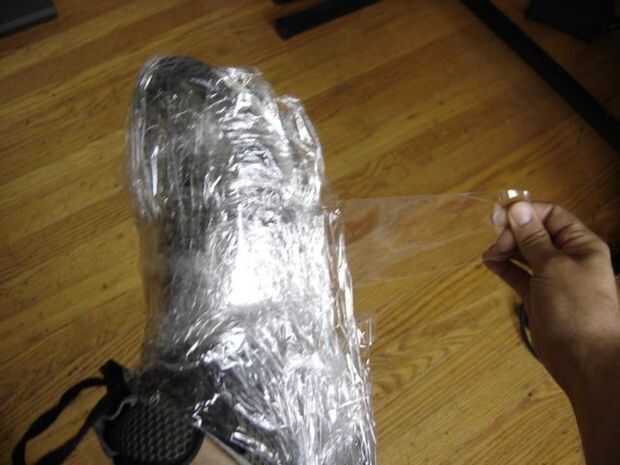 Ahora, con alguna cinta de embalaje claro, vas a envolver los zapatos otra vez. Asegúrese de bajar una pareja capas de las cosas todo redondo. Una vez más, asegúrese de mantenerlo agradable y apretado.
