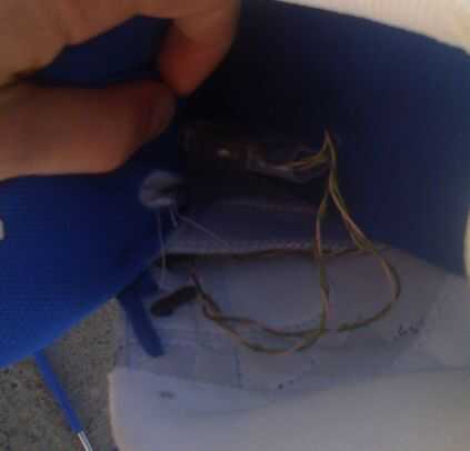 Instalar su creación modificada! Había planeado instalar el LED es la suela de la zapatilla, pero terminó utilizando los agujeros de encaje para montarlos. De esta manera la intermitente fue un poco más visible en la luz directa, y el patrón secuencial de los LEDs que el zapato se ve genial en mi opinión. El circuito de la batería se resbaló en una pequeña ranura en el lado de la lengua y debido a la amplia cantidad de relleno en este zapato que no todo sienta que una vez en el pie. En la foto es un poco de magia de encaje de zapato tuve que preforma para ate los zapatos para arriba correctamente, suerte este zapato tiene lazos pequeños para ejecutar los cordones a través de que podía usar para liberar los huecos de encaje para LEDs.