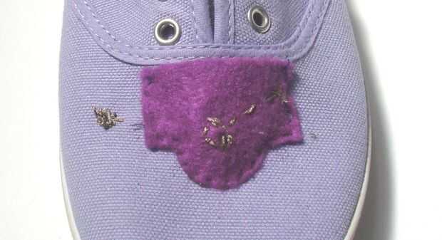 Alinee las esquinas del fieltro con las marcas que pones en el zapato. Asegúrese de que el lado sin marcar el fieltro quede hacia arriba. Coser por el borde exterior de fieltro usando el hilo regular. No coser la parte superior de fieltro cortar ya es donde entra la batería.