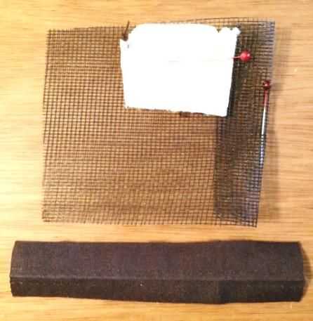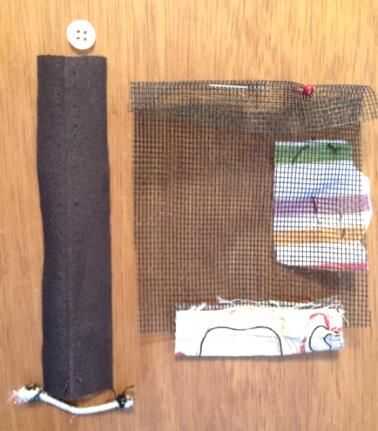 Opción B: un inserto para endurecer la zona de cierre (yo usé una tira de malla de lona de plástico punto de cruz o una tira de la tapa del yogur)- Pequeño pelo elástico
