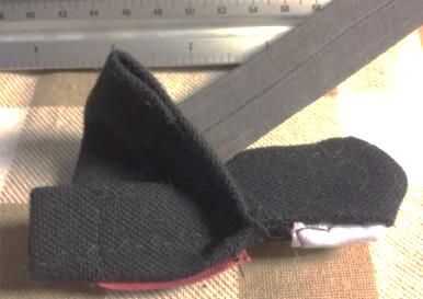 Opción A: coser en la banda rígida o bien por el borde largo de la banda, o (para hacer un "cinturón" que se envuelve alrededor del zapato) coser un extremo corto en el borde del cuerpo que va a ser en el exterior de la tri-fold.