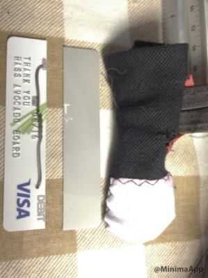 - Dobladillar los 2 extremos del cuerpo, dobladillo en la abrazadera de refuerzo de tarjeta de crédito y cuchillo en el extremo que se pliega en el interior del zapato.