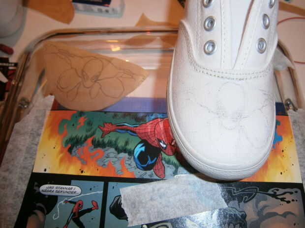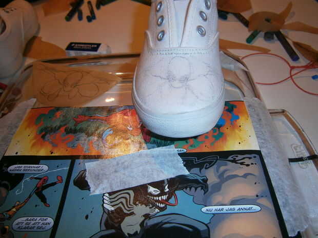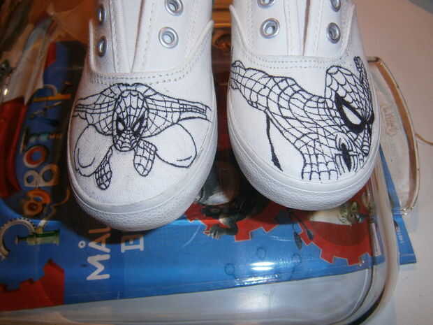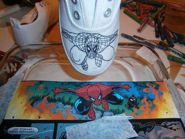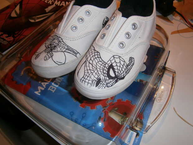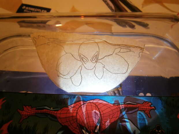 Spider-man se hace con puntas puntiagudas de los marcadores de DVD y realmente llegan al lugar y no sangran en sí después del secado. Sólo hice el contorno, las líneas del traje sólo intenté ver donde comenzó y terminó.